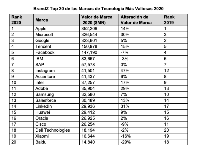 Las 20 marcas de Tecnología más valiosas de 2020 están lideradas por Apple (+ 14%, USD 352.200 millones), Microsoft (+ 30%, USD 326.500 millones) y Google (+ 5%, USD 323.600 millones). Ellas también dominan el tope del ranking BrandZ Top 100 en 2ª, 3ª y 4ª posiciones, respectivamente. El gigante chino de servicios de Internet, Tencent (+ 15%, USD 151.000 millones), y Facebook (-7%, USD 147.200 millones) completan las cinco marcas tecnológicas más valiosas de BrandZ 2020, ubicadas en 7° y 8° puestos, respectivamente, dentro del Top 100.