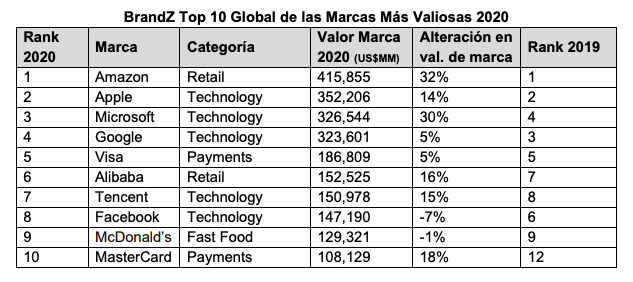 - El ranking 2020 revela el crecimiento indiscutido del poder y la influencia de la tecnología en el valor de marca.