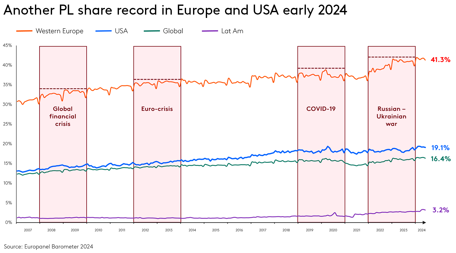 From the get-go, PL had an advantage as their survival rate trumps that of branded new products, also their natural charm with low- and high-income households puts no limits on purchase intent. But it’s macroeconomics that fueled their prosperity; every single crisis of our permacrisis has accelerated the market share of PL, chipping away at that of brands.