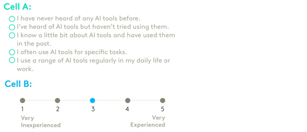 In the final experiment, we explored how response scale design affects answer quality. Two questions in the survey asked respondents how experienced and how comfortable they were with AI.