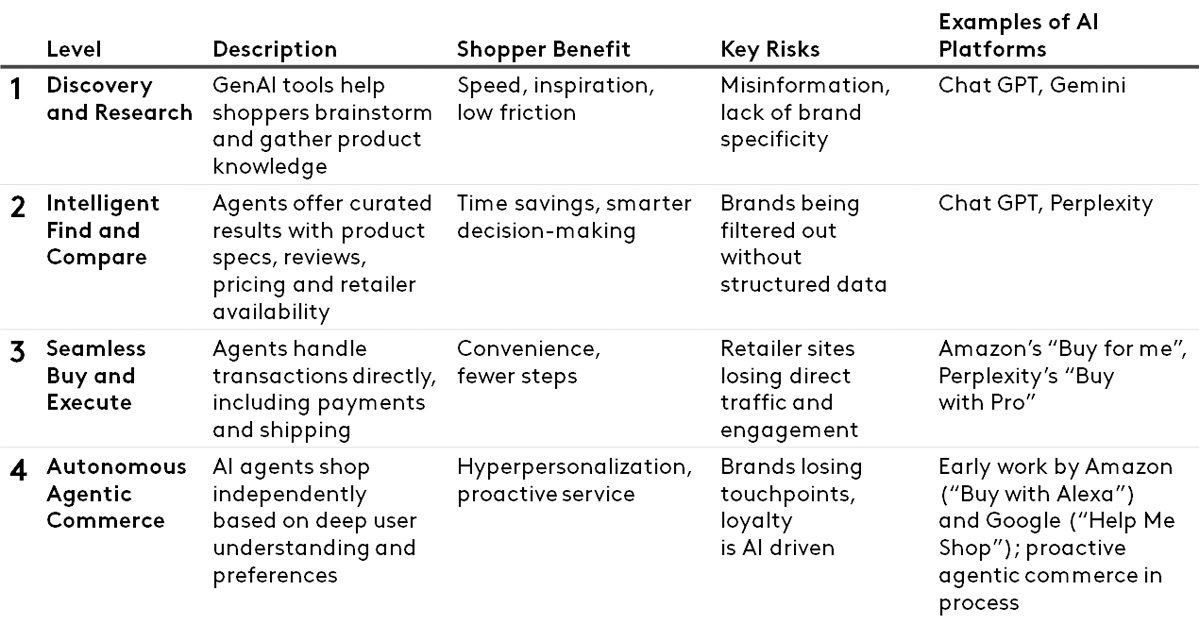 At this final stage, AI agents no longer wait for commands. The agents proactively anticipate a shopper’s personal needs and purchase items based on data patterns, preferences, and context, all without the shopper making a request.