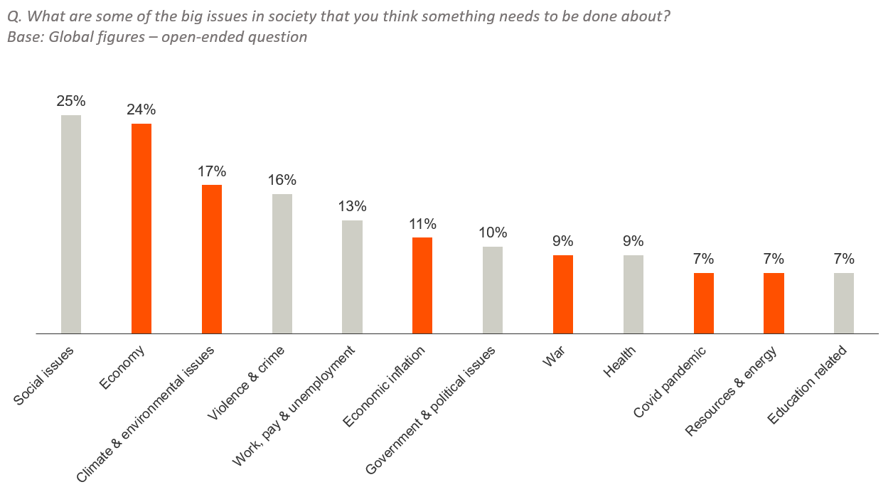 A key finding from this study is that, although inflation is a key concern for people, it is not experienced in a vacuum. In people’s minds, challenges linked to the economy and climate change are altogether amounting to a general sense of risk and both need to be solved.