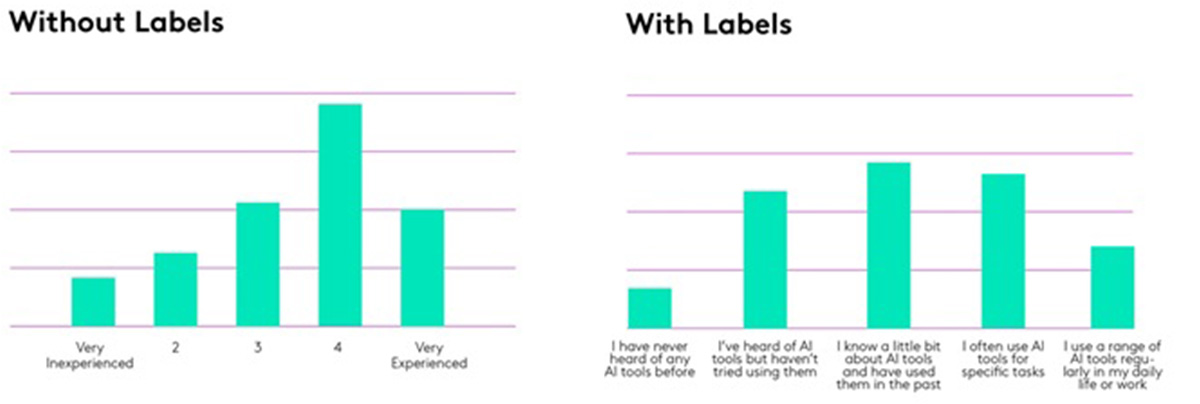 In the final experiment, we explored how response scale design affects answer quality. Two questions in the survey asked respondents how experienced and how comfortable they were with AI.