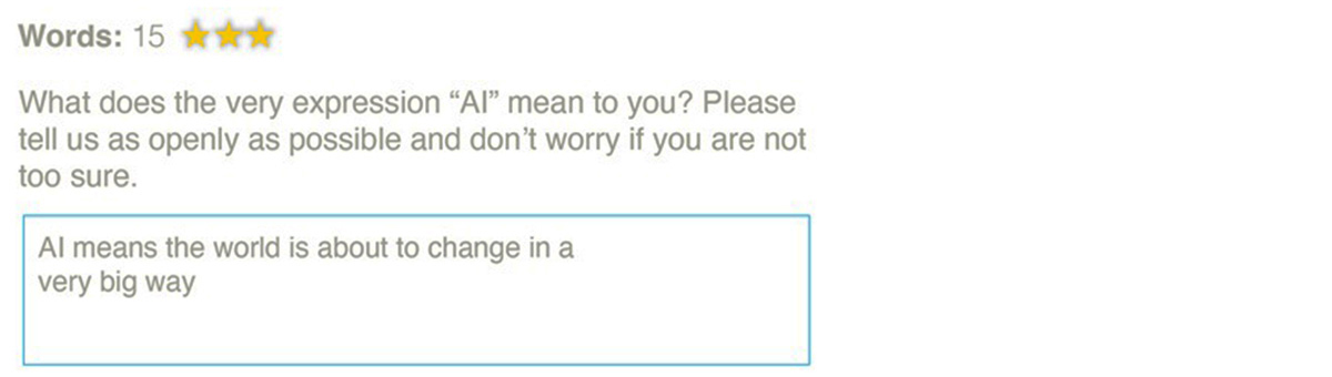 Half of our respondents were asked, “What does the very expression ‘AI’ mean to you?” in a standard open-text box. The other half saw the same question, but with a star rating (up to five stars) and a character counter.