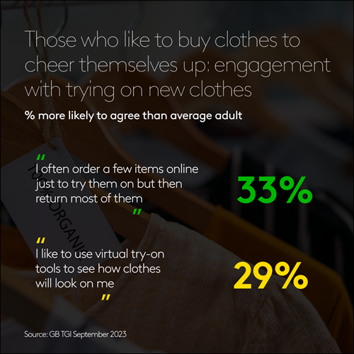 However, increasingly there are other options that can help consumers to avoid needing to return clothes, such as virtual try on tools, which are particularly engaged with by those who like to buy new clothes to cheer themselves up.