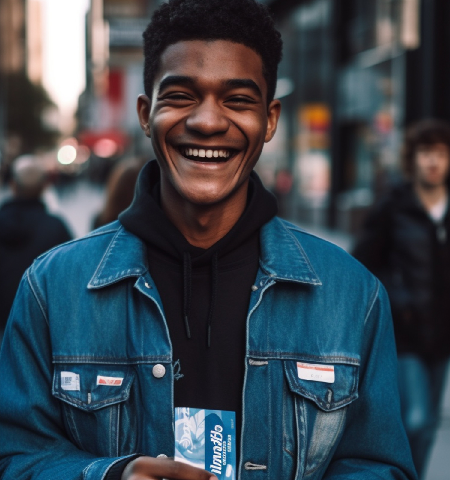 Image 2 prompt: “Street-style advertisement photo full-body shot of person in a blue jacket, smiling wide and showing his teeth, in downtown New York while holding a small blue pack of gum in a rectangular shape in his right hand and showing it to the camera like an advertisement, sunset lighting - aspect ratio 9:16 --stylize 1000”: