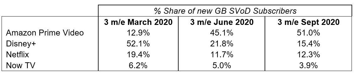 - Amazon Prime Video secured more than half of all new SVoD subscriptions in the quarter driven by an increase in Prime Membership