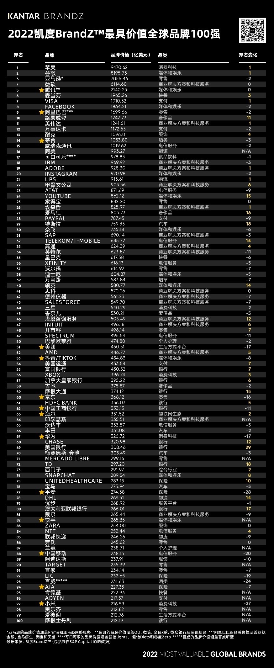 2022年凯度BrandZ™最具价值全球品牌各行业第一名