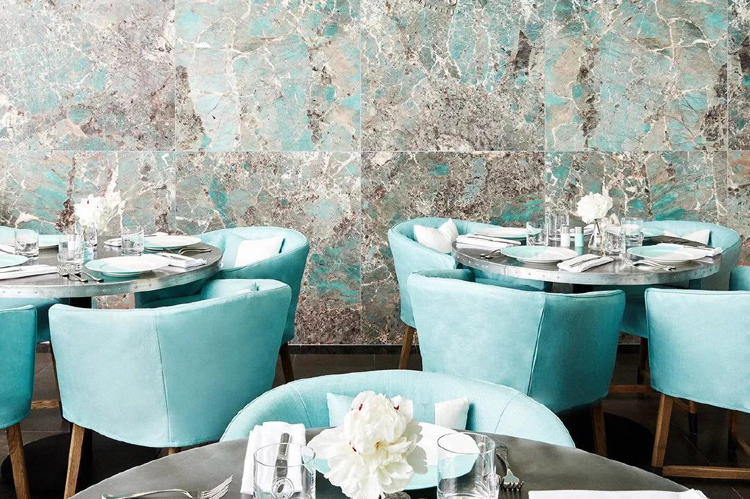 美国奢侈品牌蒂芙尼开设的咖啡馆摒弃了冗余的浮夸装饰,只运用品牌标志性的蒂芙尼蓝来彰显其高级感。
