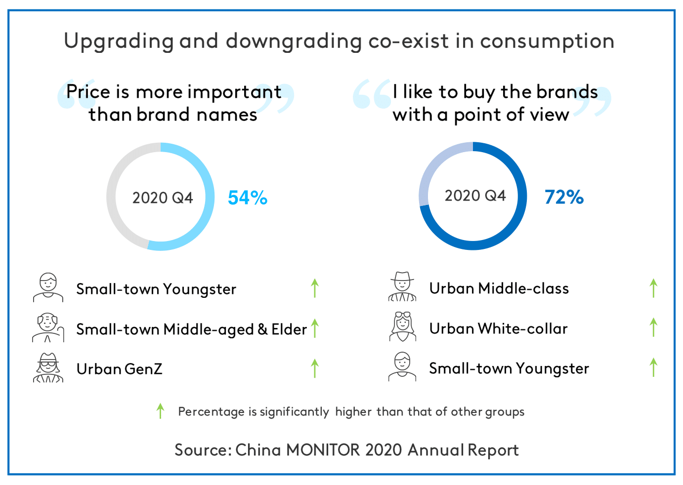 The expansion of China’s economy, propelled by diversified growth engines, has created multiple layers of shopping preferences towards “value” and “price”: consumers like premium goods, but on some occasions they are also looking for value for money. Consumers with stronger purchasing power are willing to pay more for “brands taking a stand” because of their shared value and emotional bonding. Younger generations and small-town consumers, whose purchasing potential are yet to be tapped further, care more about what they are paying for and product functions.