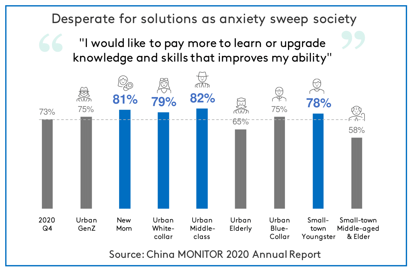Chinese consumers are desperate to find a way out: they are seeking groups/communities that can recognise their views, and are also investing to improve themselves to feel safer and fight against anxiety.