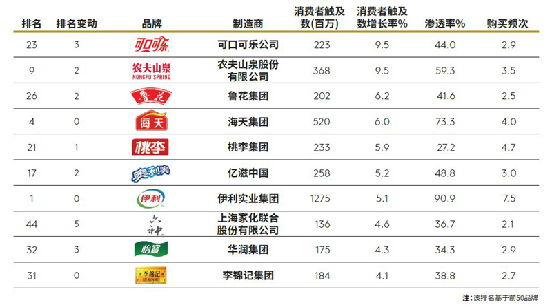 在凯度消费者指数(Kantar Worldpanel)刚刚发布的2019中国品牌足迹报告(2019 Brand Footprint Report)中,已经连续多年被中国品牌占据的增速最快品牌榜上,可口可乐意外成为消费者触及数增长最大的品牌。(2018和2017年增速第一均为农夫山泉,且前十中各只有一个外资品牌:2018年养乐多第6、2017年乐事第10)