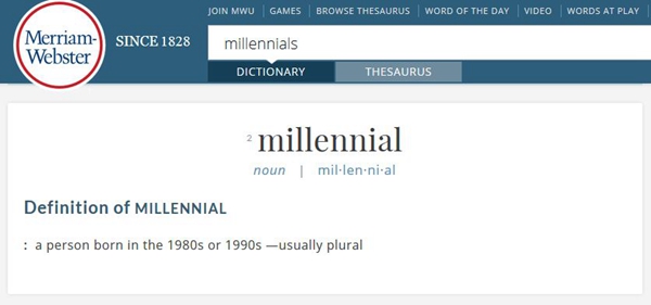 韦氏字典:千禧一代:出生在1980或1990年代的人,常用复数。