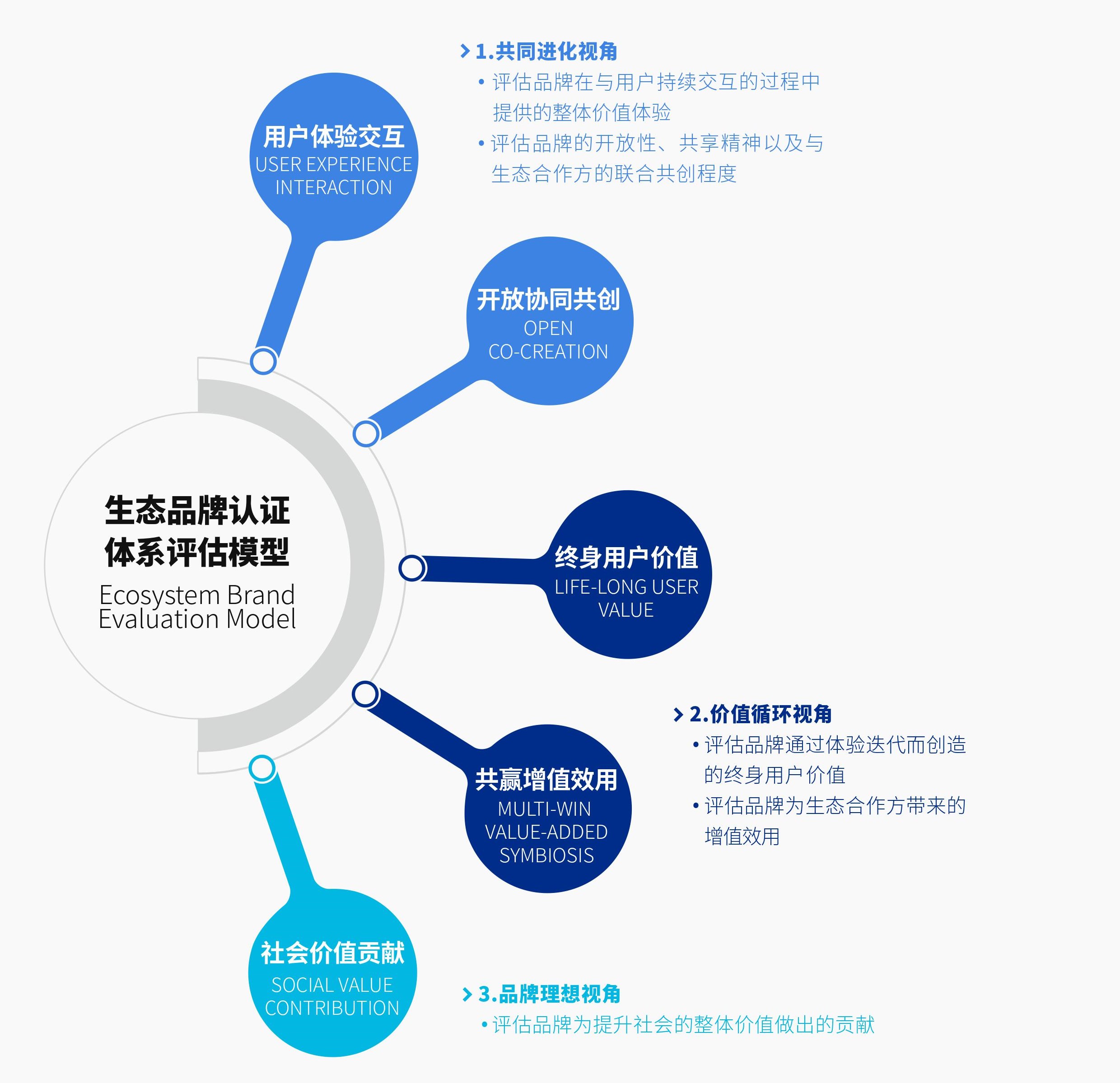 为了评估与衡量品牌的表现,生态品牌认证体系评估模型从三大视角出发:共同进化视角、价值循环视角以及品牌理想视角。