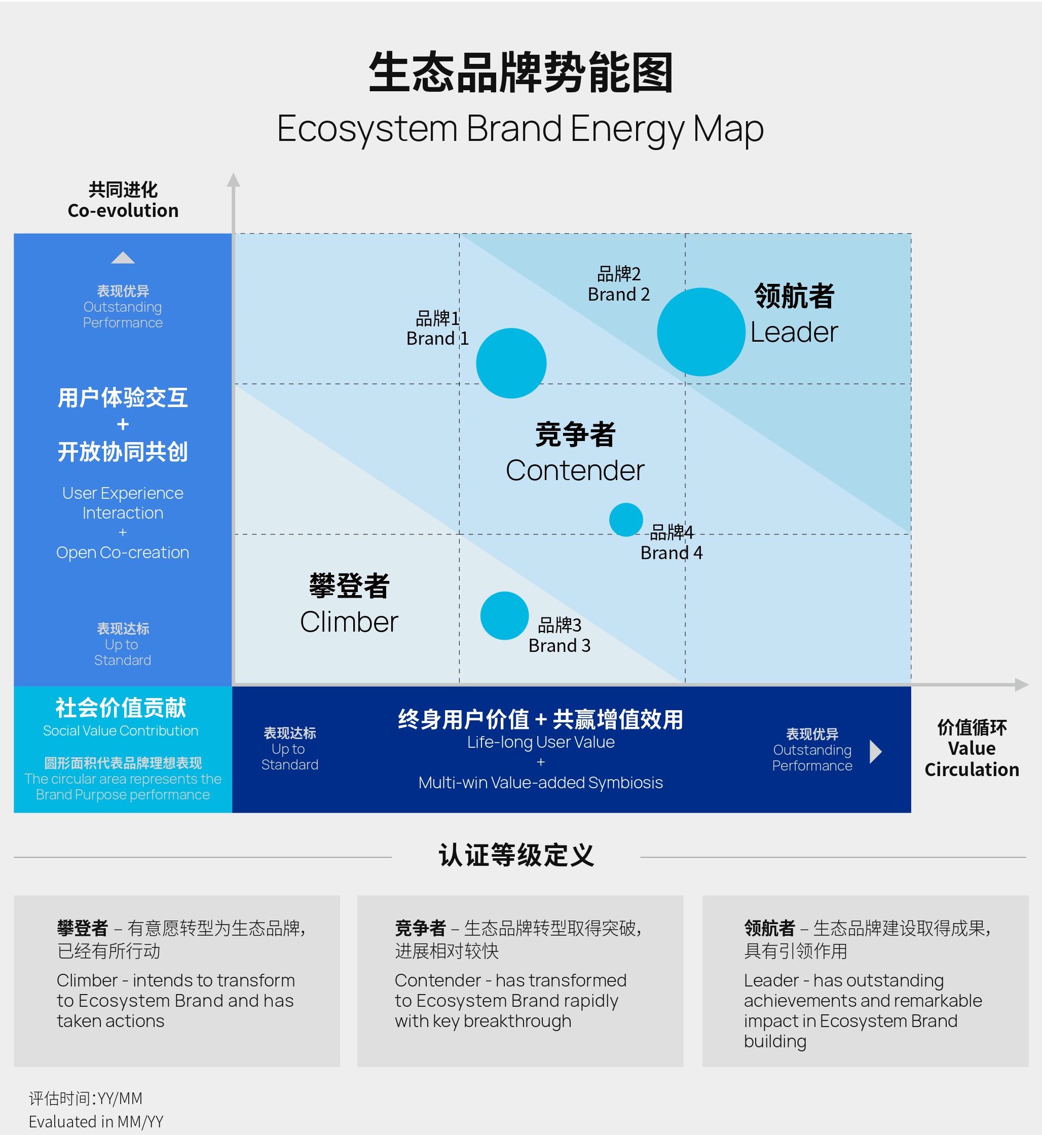 认证方将基于参评品牌的表现指数,输出生态品牌认证的最终结果——生态品牌势能图。