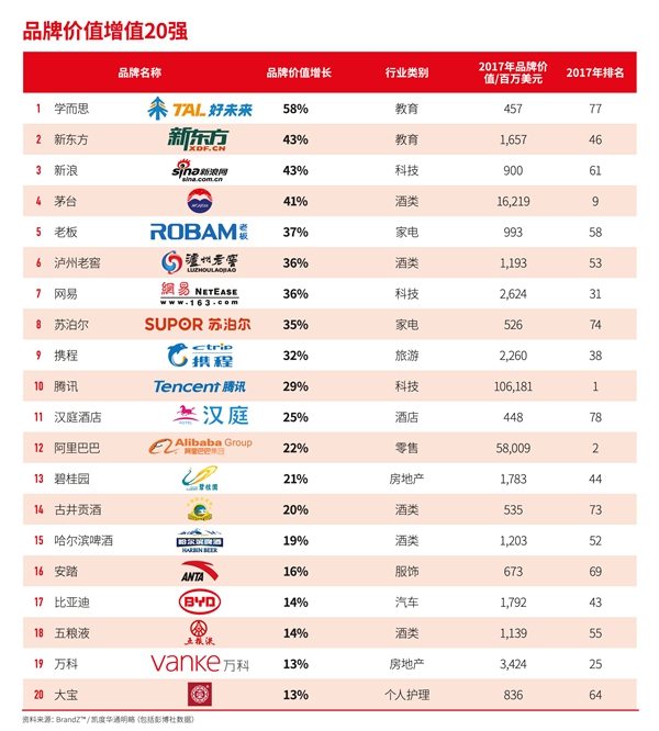 * 2017年,有9个品牌首次进入BrandZ™最具价值中国品牌100强:零售网站-唯品会(排名第40);中信银行(排名第48);科技品牌-爱奇艺(排名第50);男士服装品牌-海澜之家(排名62);旅行中介-凯撒(排名第79);汽车品牌-吉利(排名第93),服装品牌-森马(排名第95)、华帝(排名第9号),家电制造及零售商-国美电器(排名第100)。