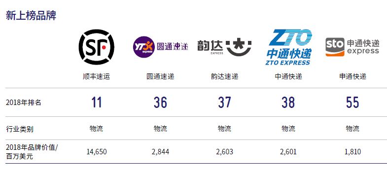 * 2018年新进榜单的品牌有:物流公司顺丰速运(排名第11),圆通速递(排名第36),韵达快递(排名第37),中通快递(排名第38)和申通快递(排名第55);;旅行社去哪儿(排名第63);酒品牌国窖1573(排名第66);房地产公司绿地集团(排名第73);保健品牌东阿阿胶(排名第58名)、汤臣倍健(排名第86)和家电品牌飞科(排名第88)。