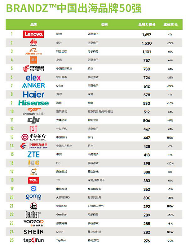 2018年BrandZ™中国出海品牌50强研究的关键亮点包括: