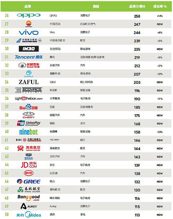 * 在今年50强中,包含四个汽车品牌、两个国有最大石油天然气巨头、三家国有银行与支付网络以及五家中国航空公司。