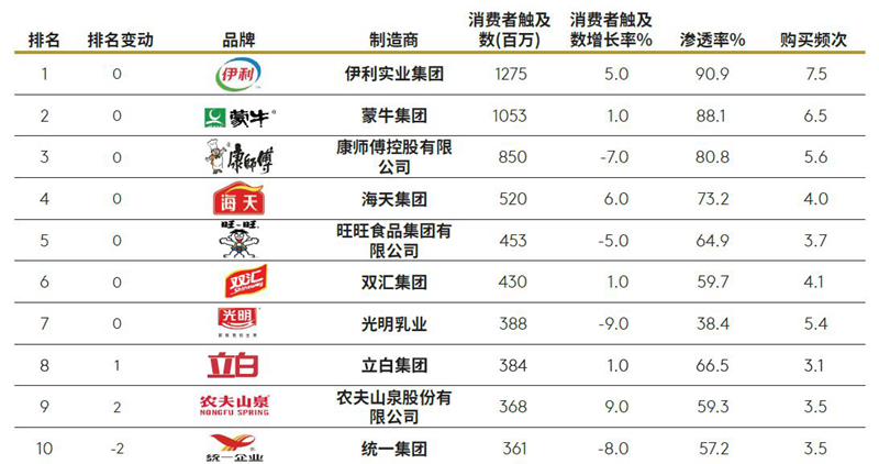 在今年的报告中,消费者选择次数最多前十名的品牌依然被中国品牌包揽:伊利和蒙牛依然是消费者选择超过10亿次的品牌;康师傅排名第三。